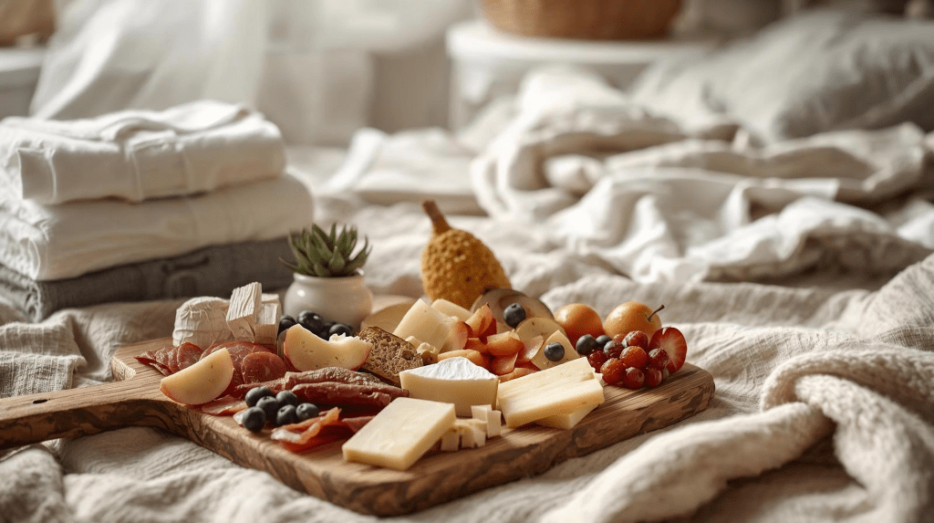 We planned for slow mornings and home-centered days: in-bed card games, family movies, late breakfasts, snacks passed around, and early dinners shared within reach of the blankets.